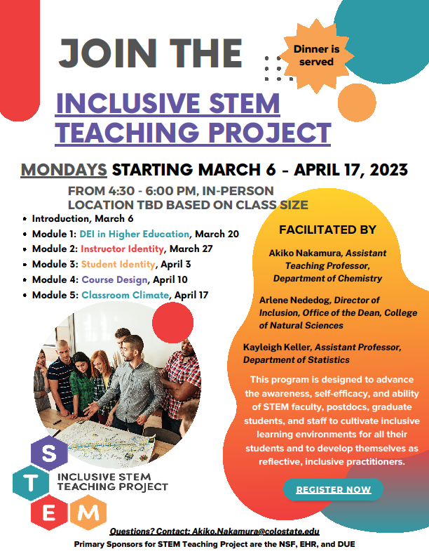 For this week’s tip, I wish to call attention to the “Inclusive STEM Teaching Project” organized and facilitated by Akiko Nakamura (Chemistry), Kayleigh Keller (Statistics), and Arlene Nededog (CNS). These workshops are funded by NSF and offered on Mondays between March 6 and April 17, 2023. For more details see the attached flyer.